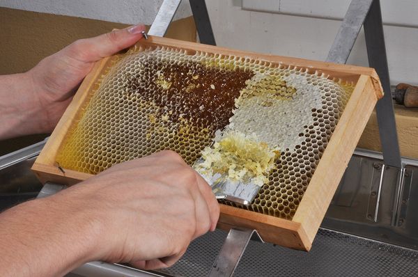 Entdeckeln Der reife Honig in den Zellen wird von den Bienen mit einem Wachsdeckel versiegelt. Vor dem Schleudern der Waben werden diese Wachsdeckel entfernt.